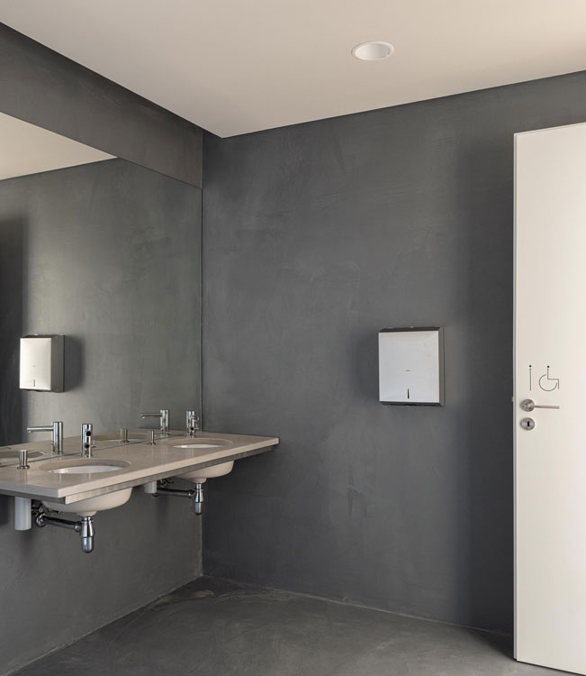 The minimalist yet warm bathroom design features grey walls and grey marble countertops that complement the white ceramic qualities of pieces such as Roca’s Foro under countertop basin and the Meridian basin. This vision carried over into the public bathroom spaces as well, where the design focussed on clean, modern aesthetics with functional, versatile products. The timeless design of Inspira’s wall-hung toilet was a perfect anchor in the bathrooms, providing a touch of elegance and comfort. The curving form of the Euret urinal complemented the look, while its electronic features make it an ideal choice for public use. The Access folding grab bars provided reassurance and enhanced accessibility.