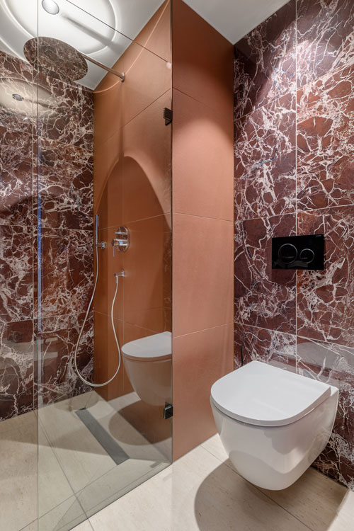 The pared-back geometry and polished finish of the Stella Stick hand shower and Raindream round shower head enhance the industrial nuance of the bathroom design while maintaining a refined, contemporary tone. The result is a layered aesthetic in which art deco references emerge subtly through material richness and curved silhouettes rather than overt ornamentation.