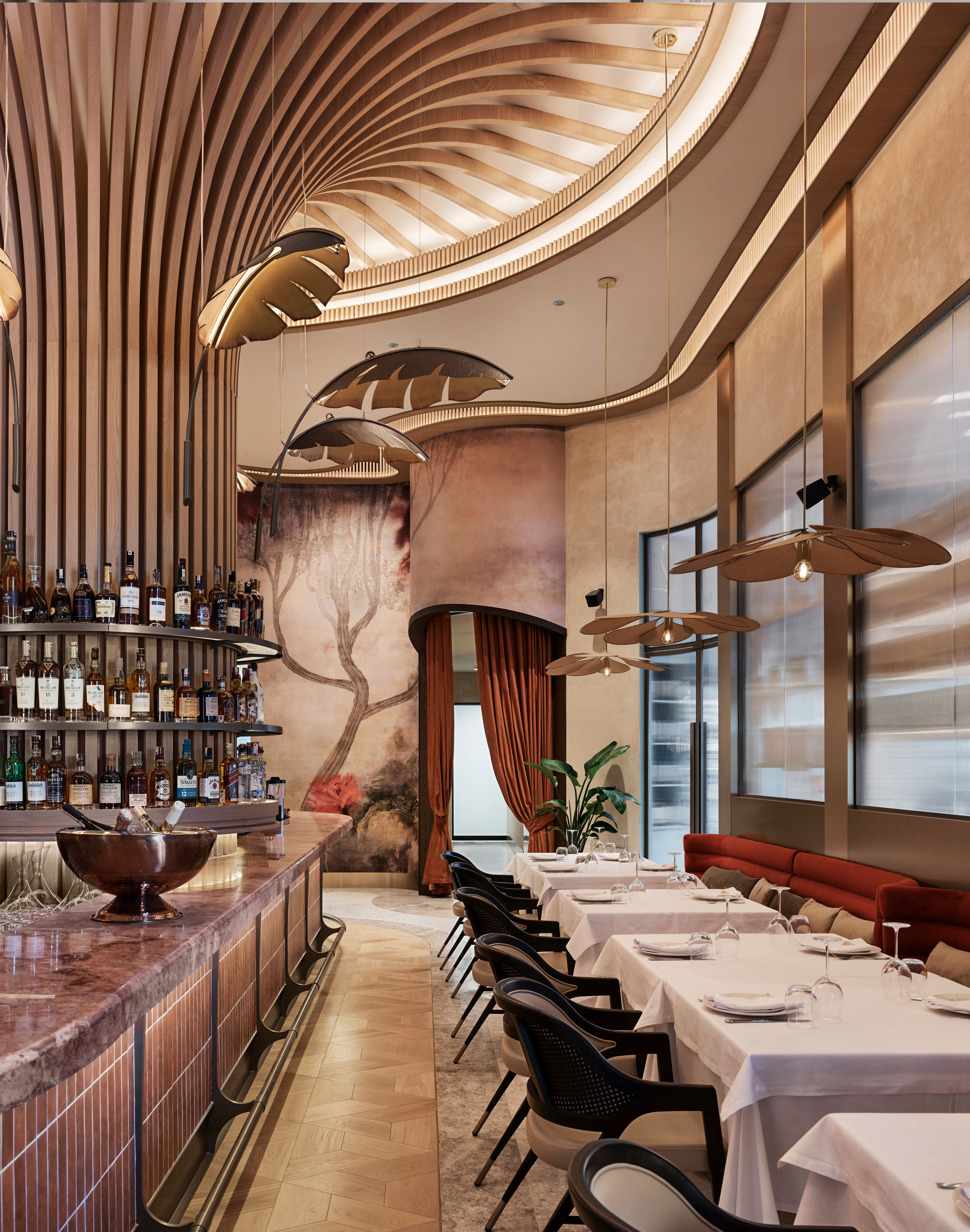 In keeping with this design approach, every detail was carefully considered to enhance the natural, organic feel of the space. From plant installations applied behind glass to the intricate use of ceramics and natural stone, the dining areas evoke a sense of harmony and warmth, making the dining experience an immersive cultural journey.