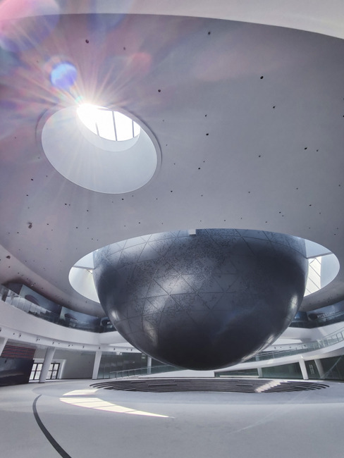 Museum's architecture beautifully captures the essence of the galaxy and seamlessly integrates with urban ecology. The use of arches on the façade and the winding greenery surrounding the museum represent the spiral arms of the galaxy. Inside, the proportional relationship of the planetarium sphere to Shanghai’s Dishui Lake reflects the Earth-Sun dynamic, creating a cohesive thematic representation.